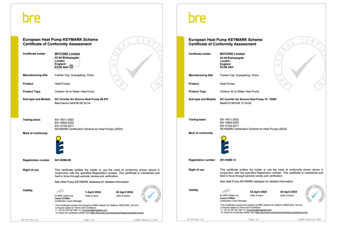 Mycond-Wärmepumpen für den Hausgebrauch haben das Keymark-Zertifikat erhalten! Wir freuen uns, Ihnen mitteilen zu können, dass Mycond, bekannt für seine Innovationen im Bereich der Klimageräte, das Keymark-Zertifikat für seine Wärmepumpen für den Hausgebrauch der Serien Bee, BeeEco, BeeThermic, BeeSmart und MBasic erhalten hat. Das Zertifikat beweist nicht nur die ausgezeichnete Qualität und die hohe Leistung der Mycond-Wärmepumpen, sondern auch unser Engagement für kontinuierliche Verbesserungen und die Einhaltung der Normen.